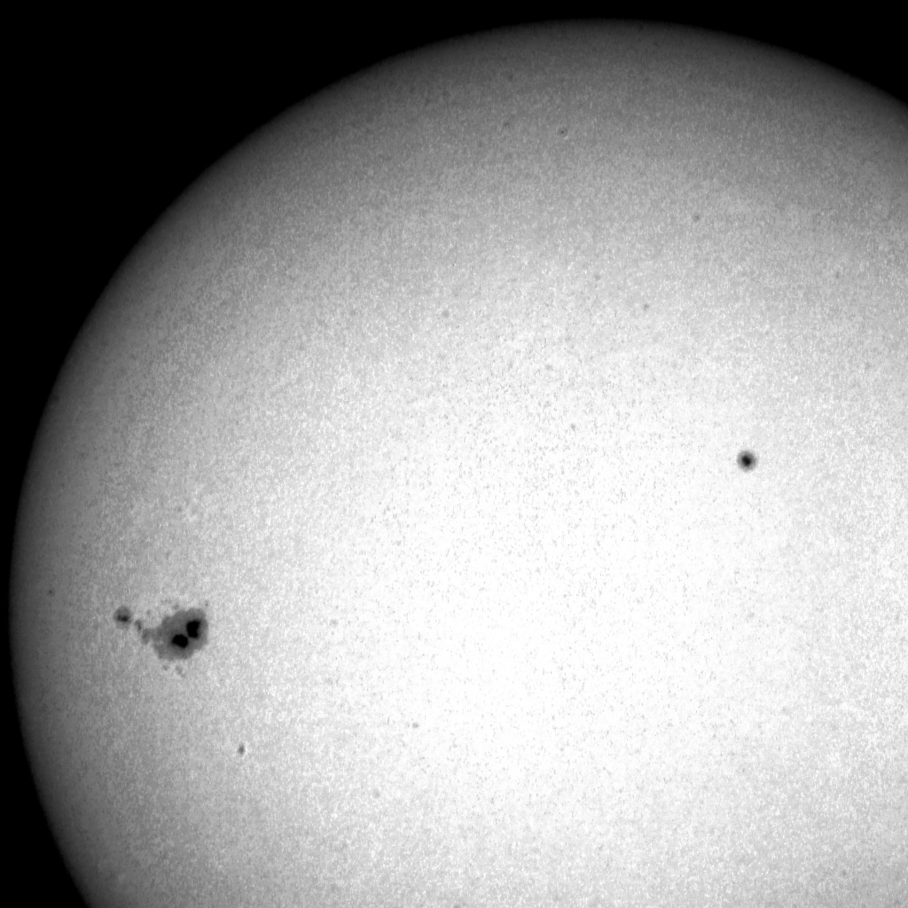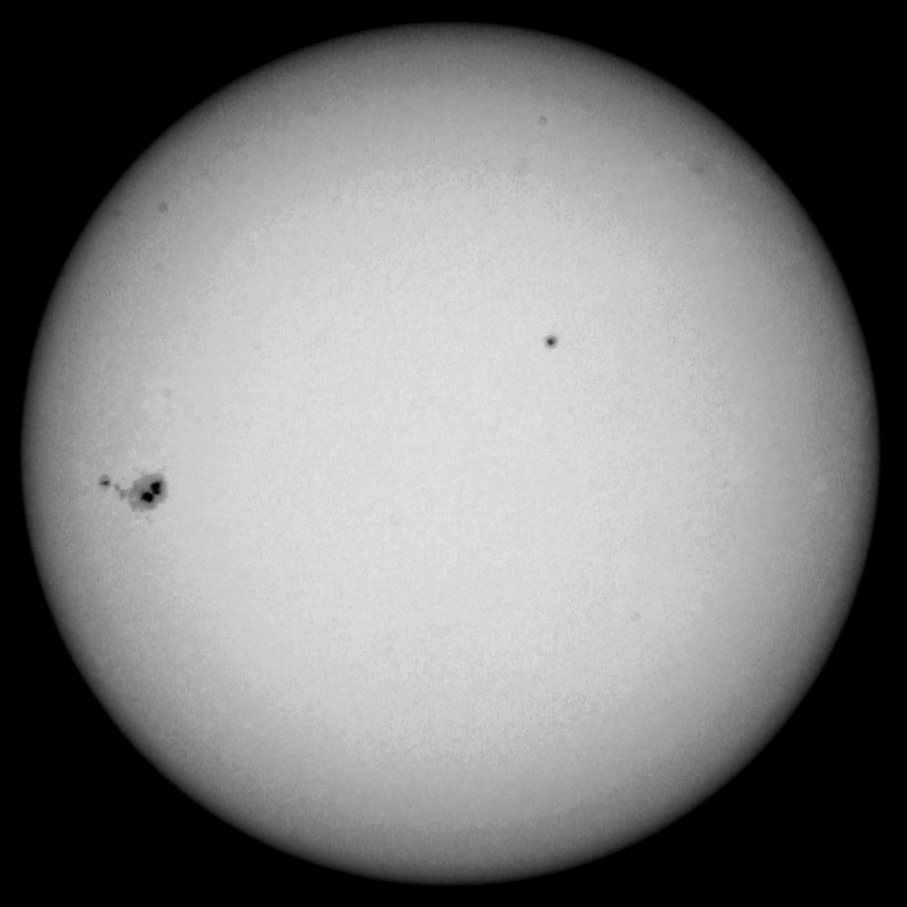 Ich bin mir nicht sicher, ob ich den Merkur tatsächlich "erwischt" habe oder ob es ein Sonnenfleck ist. Allerdings zeigt Stellarium um diese Uhrzeit den Merkur an ähnlicher Position / Brennweite 900 mm, Bild beschnitten und bearbeitet