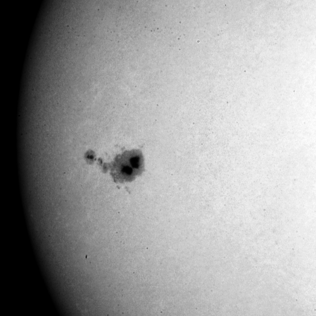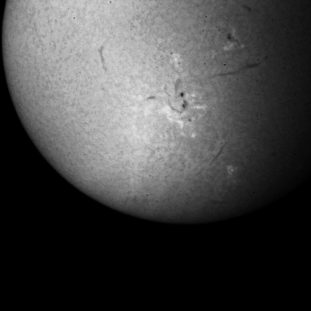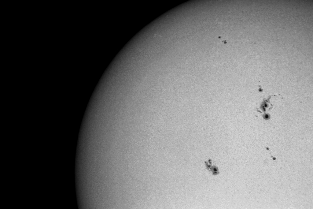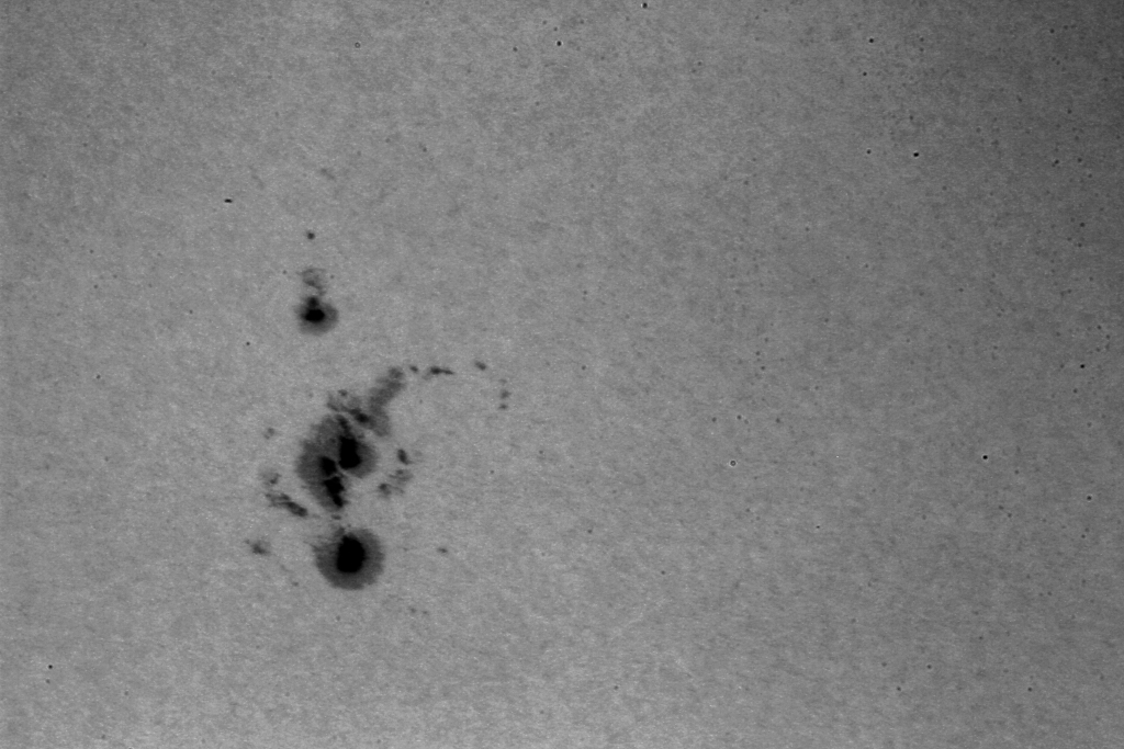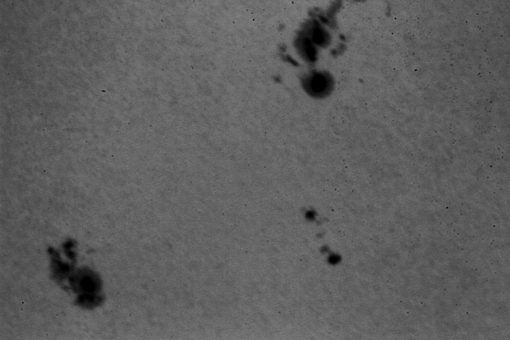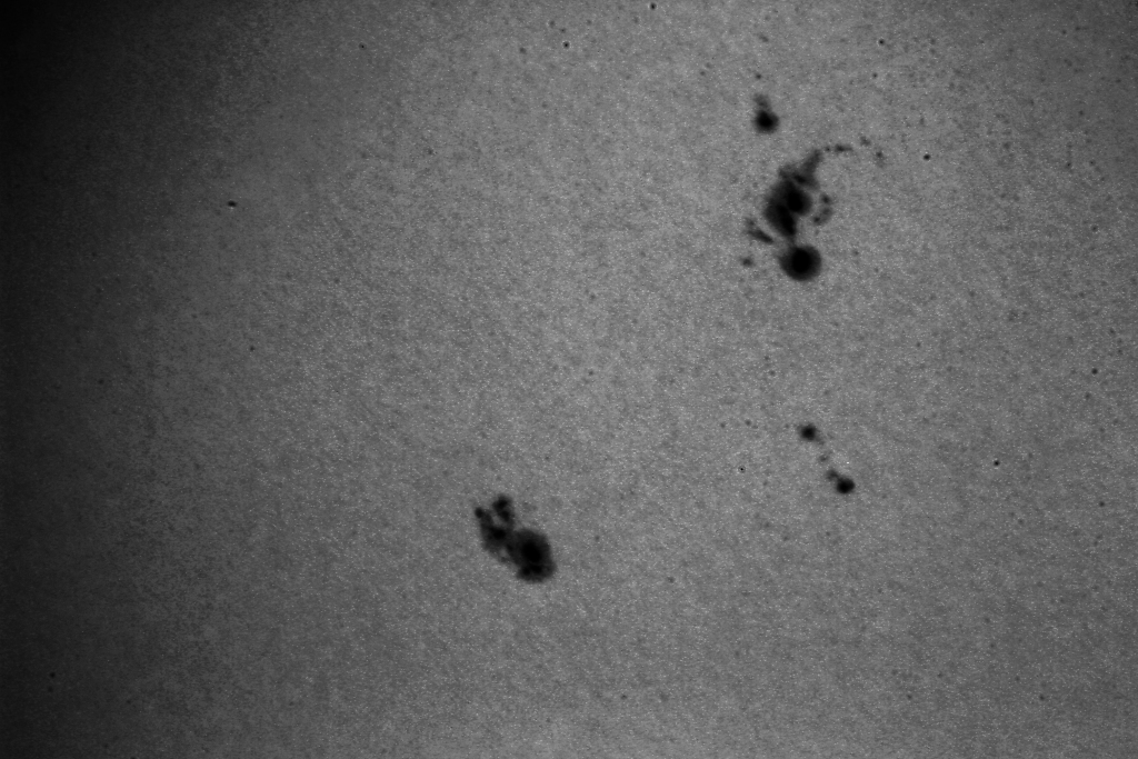 Die Sonne zeigt nur sehr schwache Aktivitäten. Im Weißlicht sind einige Flecken zu erkennen. In der Vergrößerung sind sie einigermassen zu erkennen.